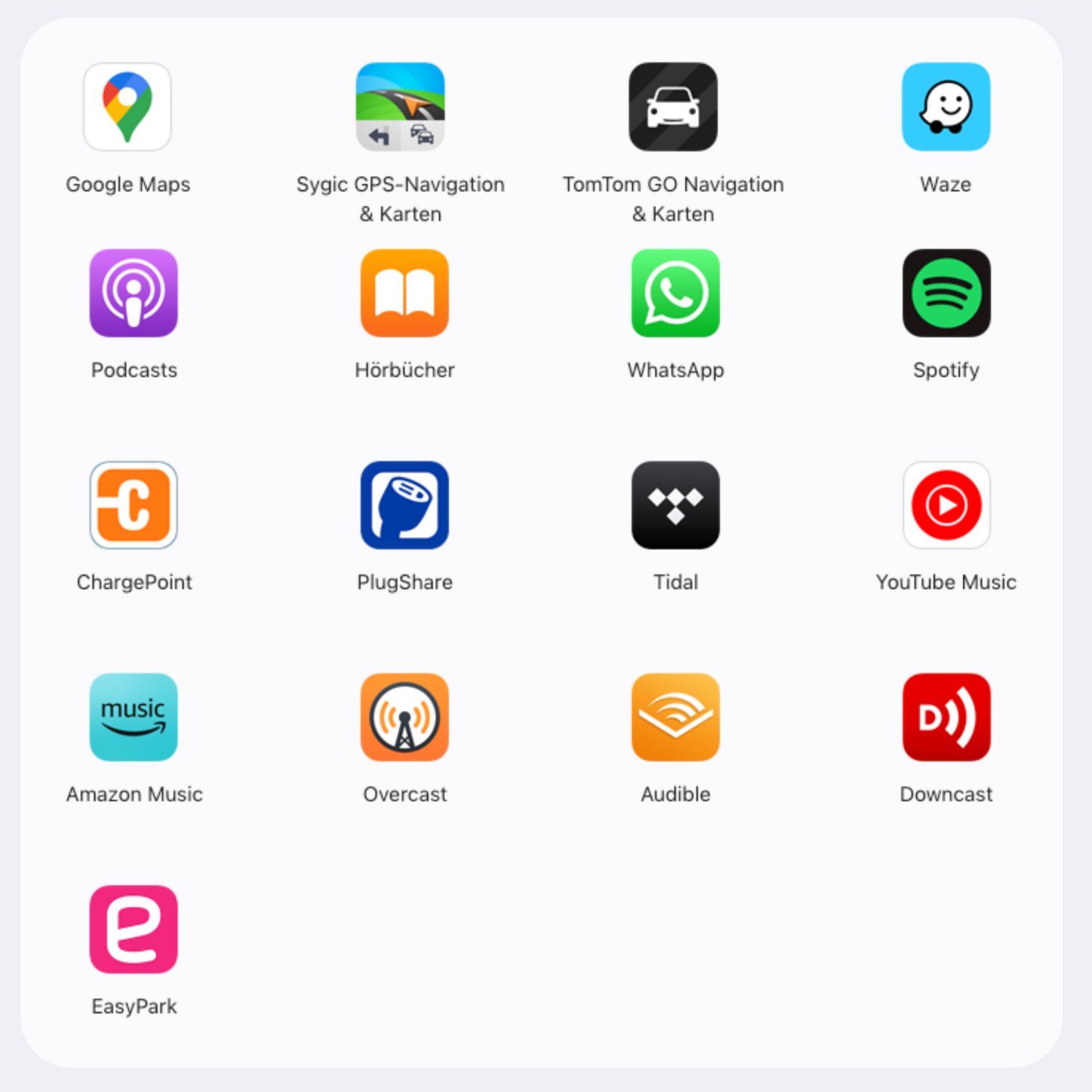 Nutze deine Lieblings-Apps sicher über Apple CarPlay oder Android Auto – inklusive Audio-Streaming, Nachrichten, Parken, Laden, Tanken uvm.